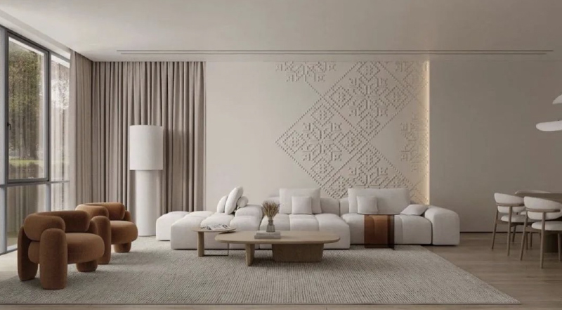 在色彩方面,轻奢风格不再沿袭传统奢侈风格大红大紫、明黄富贵或过于繁琐的多种色彩叠加方式,而是回归到色调更为稳重的中性色系,例如奶白、奶咖、水泥灰、可可棕等色彩,以突出质感和气质。